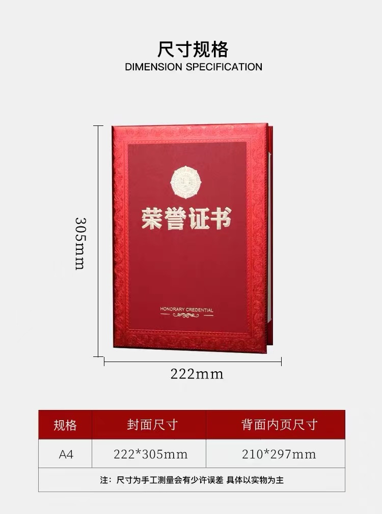1059 / A4竖款荣誉证书单边硬本封面外壳可定做封套获奖内芯打印制作